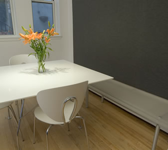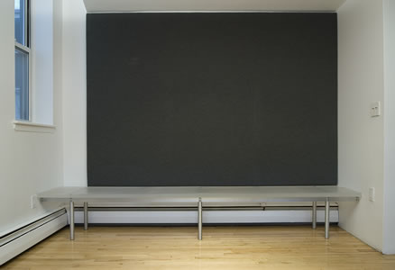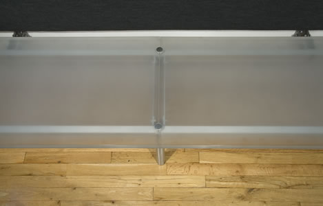 One of several upgrades to this house for a family of four was the design and installation of a bench and fabric wall panel in the dining area. For the bench, a 10’ long, 2” thick slab of sandblasted acrylic is anchored to a frame assembled from custom milled aluminum plates, rods and thru-bolts. The wall panel consists of a designer fabric sewn together and stretched over a wood frame with infill batting.
